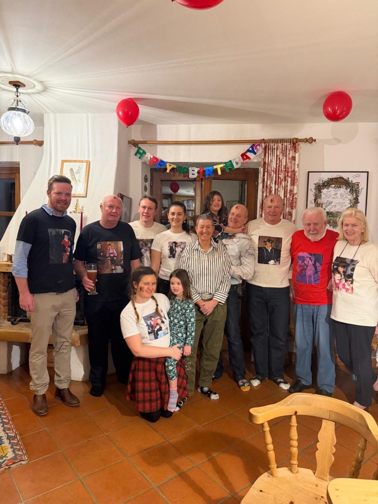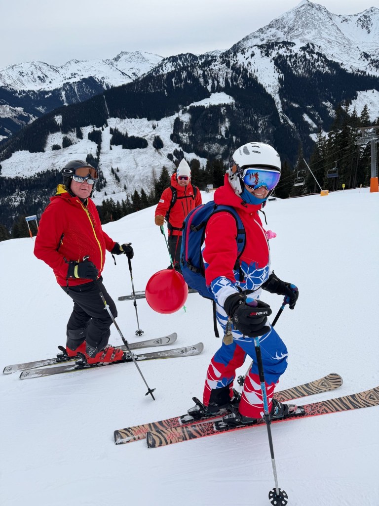 Everyone made my 60th birthday a fabulous day to remember, there was champagne at the top of the mountain in the horn Boden which was very necessary as it was so blooming cold -14 at that point , I skied with a red balloon attached to me all day courtesy of Penny and then we had a wonderful evening with musicians and lots of dancing at the chalet . There were t shirts printed with various photos of me throughout my life being worn and confetti of my face everywhere for days not forgetting the tattoos of my face all over people’s bodies , that was bad enough but it was even worse when people couldn’t get them off 😳🙈